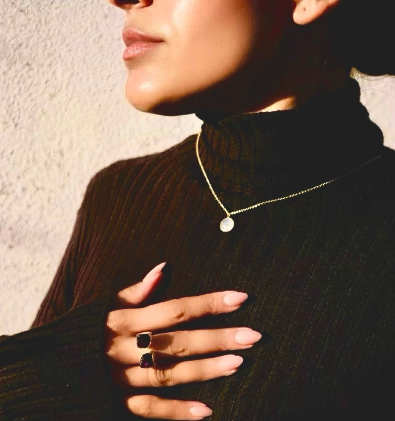 Silvery, subtle and slightly spellbound. This piece channels the moon's pull glowing softly against your skin with every phase and outfit.